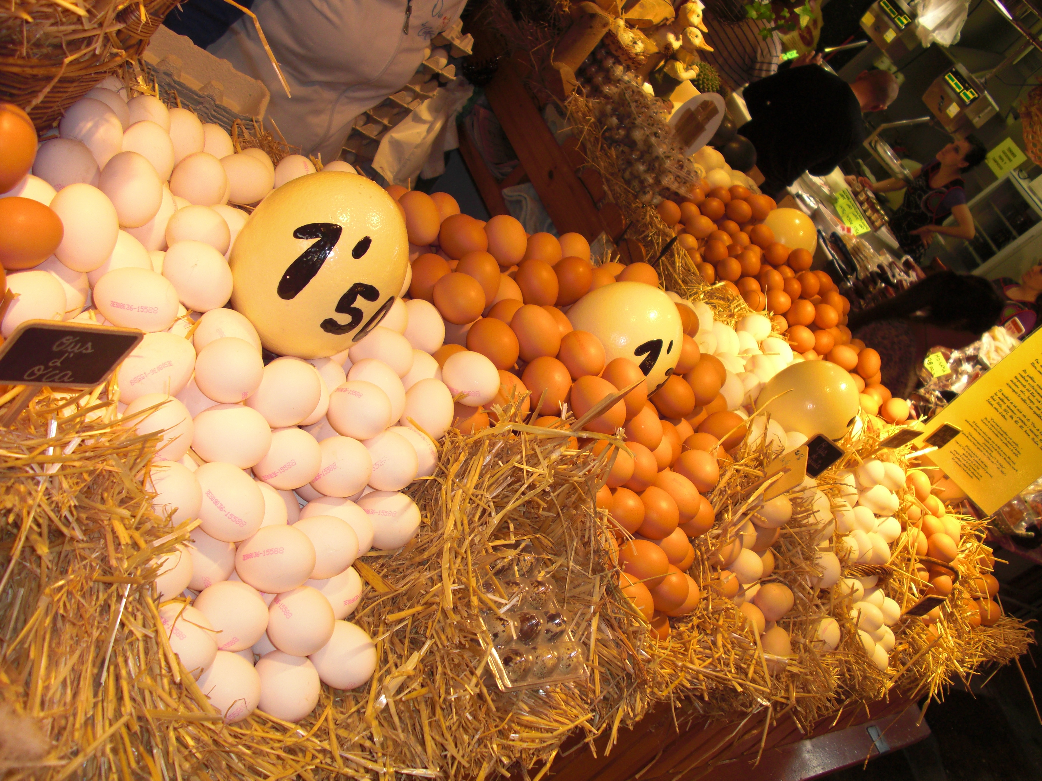 Nestled off the busy La Rambla pedestrian boulevard, La Boqueria has a small entrance that opens into a tented market bursting with brilliant colors. While the market is bustling with locals and tourists alike,  it’s not frenetic. One is meant to leisurely puruse the stalls and enjoy the bounty of products.  The stalls are laid out in an organized fashion with similar items grouped together. Most stalls focus on selling one type of item, like eggs or fruit or seafood so you can trust the purveyors know their product. There are also a few café type stalls that cook up the day’s catch.
