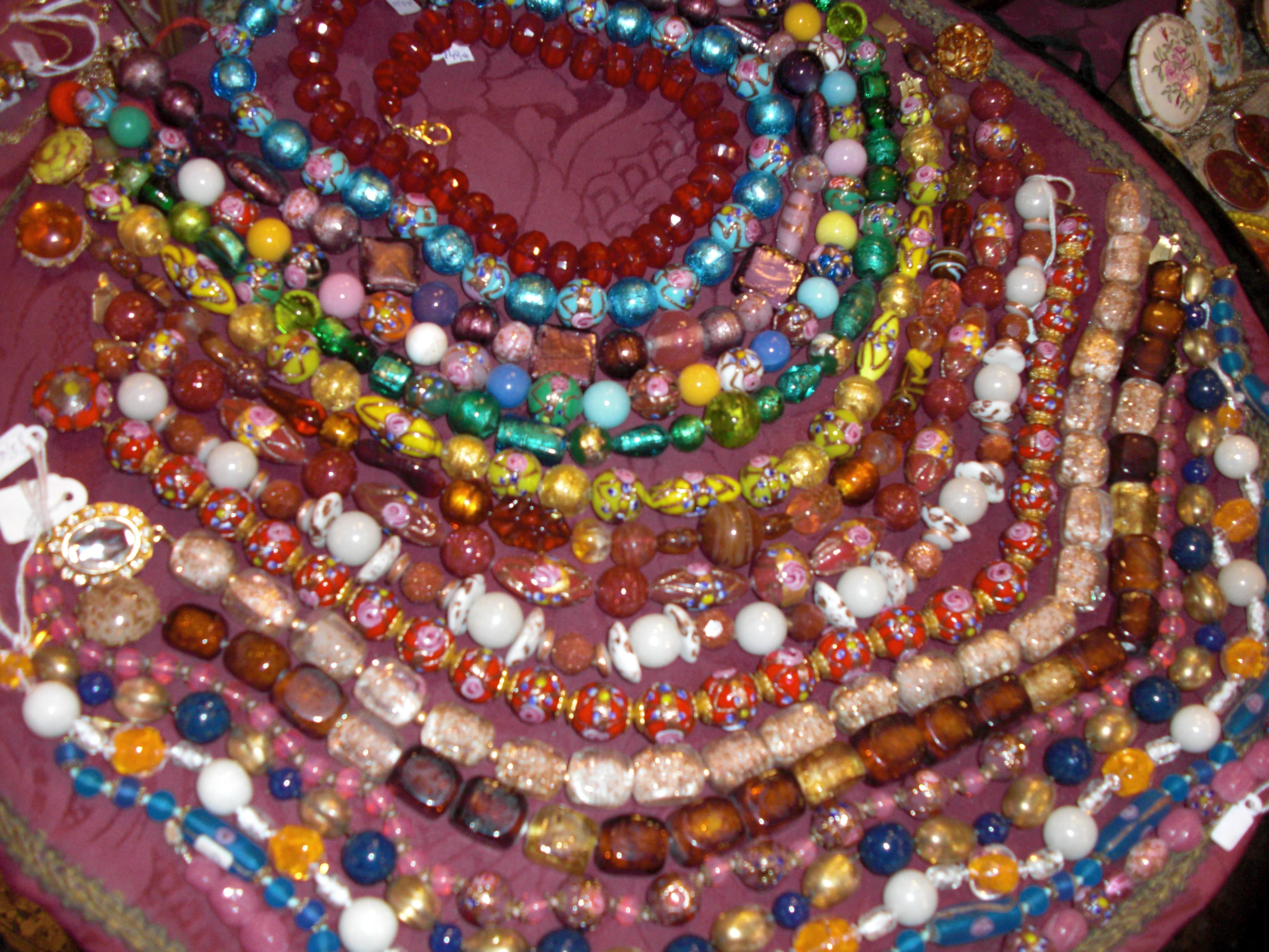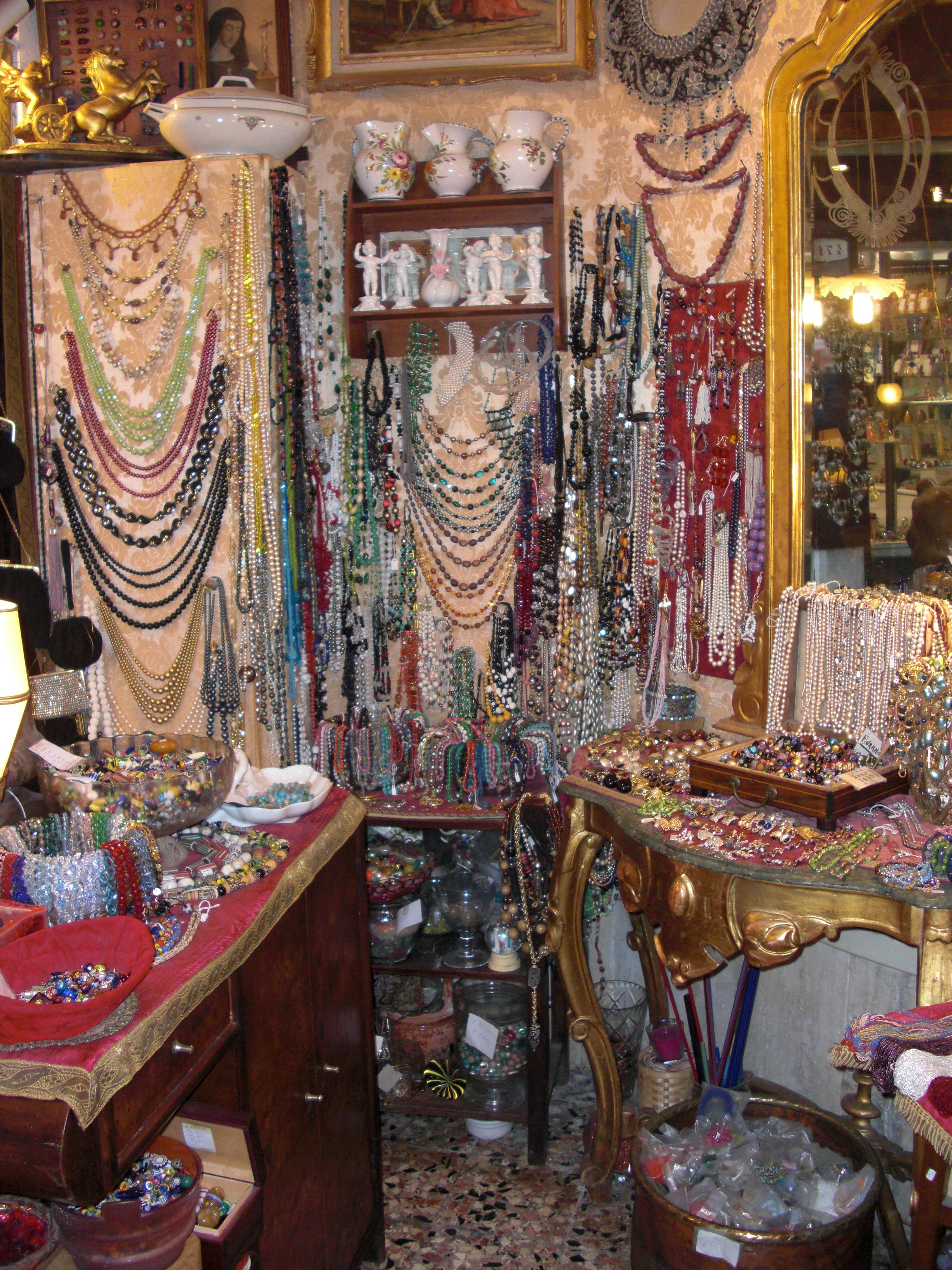 Midway through our stroll we turned the corner and stumbled upon one such hidden treasure. I love jewelry, especially handcrafted adornments with ties to the local culture. The tiny store window filled with delicate strands of Murano glass beads was enough to stop me in my tracks. As I entered this cozy antique jewelry shop, no bigger than a room in your house, I didn’t know where to look first. Every corner was covered in jewelry. Brooches, earrings, bracelets, in every hue, dripping with feminine details, filled bowls, vintage platters and antique frames.