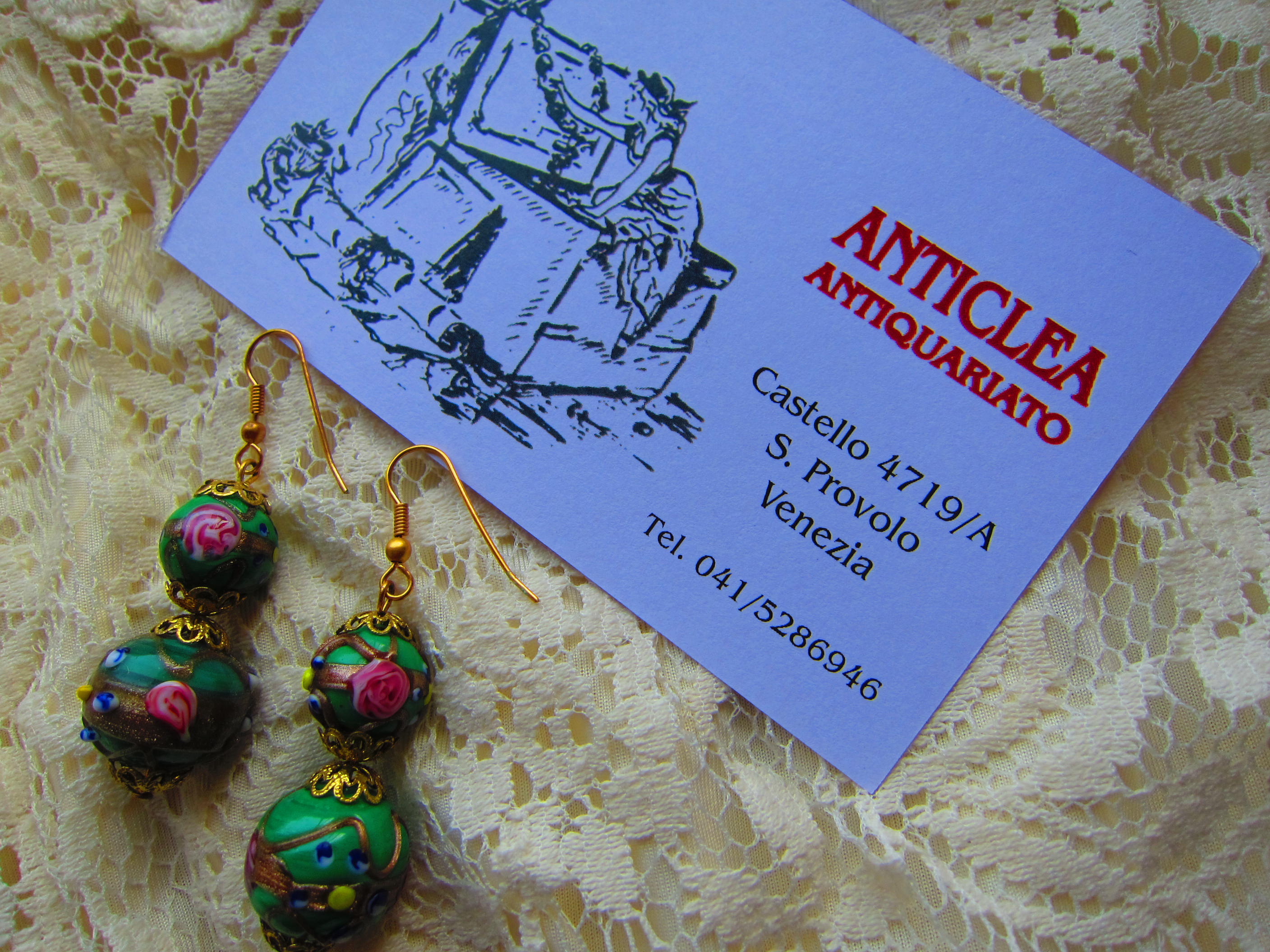 I bought these beautiful, grass colored vintage Murano glass bead drop earrings. They are decorated with gold shimmer swirls, covered in pink and red roses. The ornate gold cap beads add to their vintage appeal. I thought they were romantic and would be a beautiful addition to any Spring ensemble. I spent 20 Euro for them, which is more than I would normally spend on a pair of earrings but they are a reminder of this amazing little shop I discovered, tucked away on the streets of Venice, which is priceless.