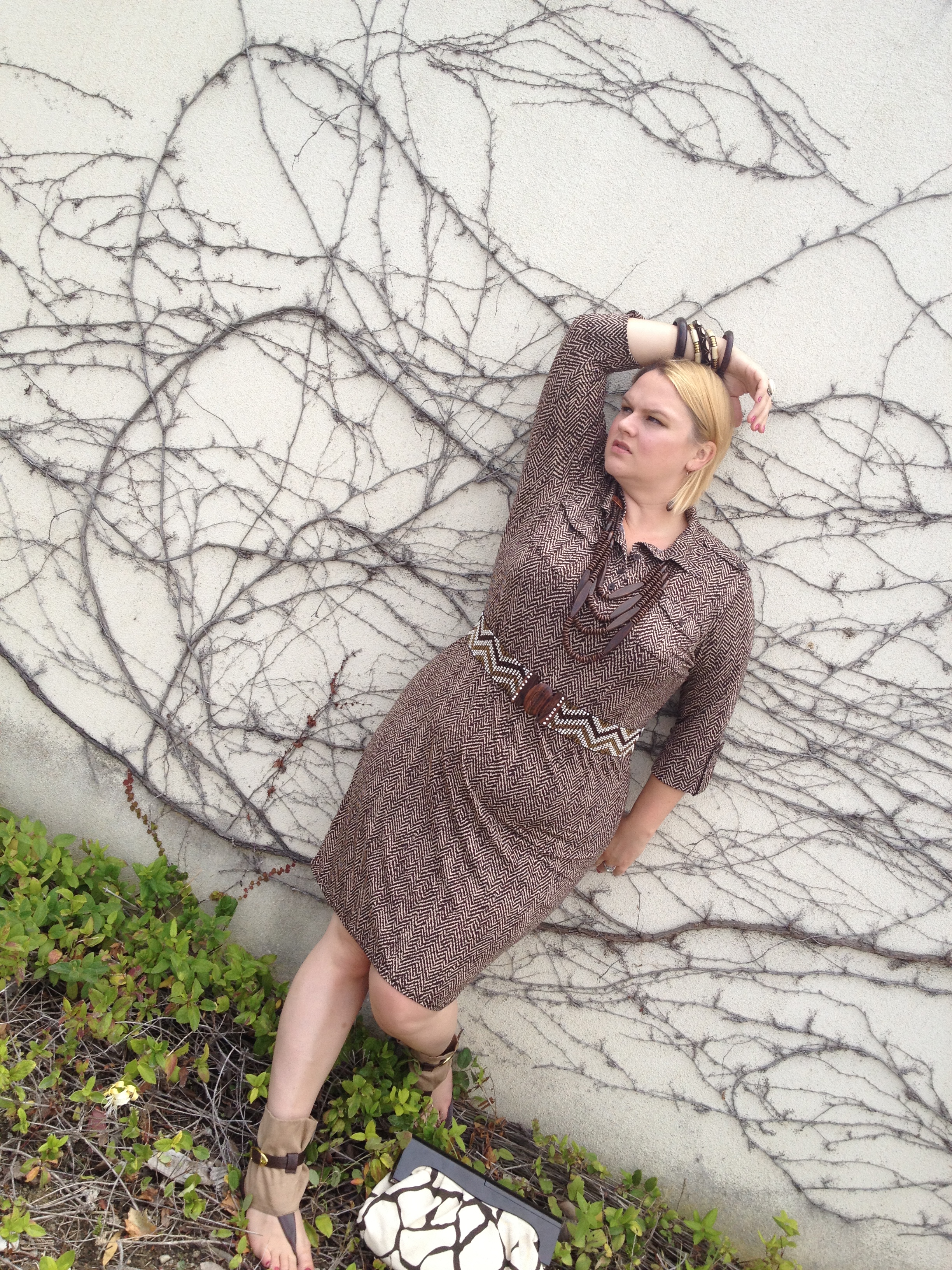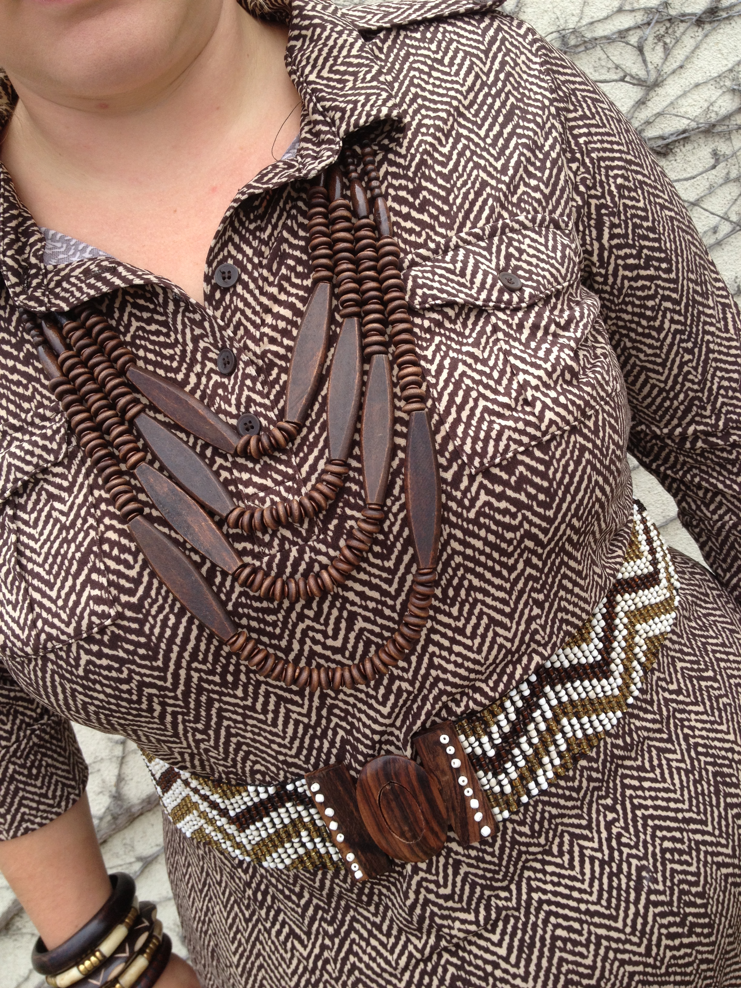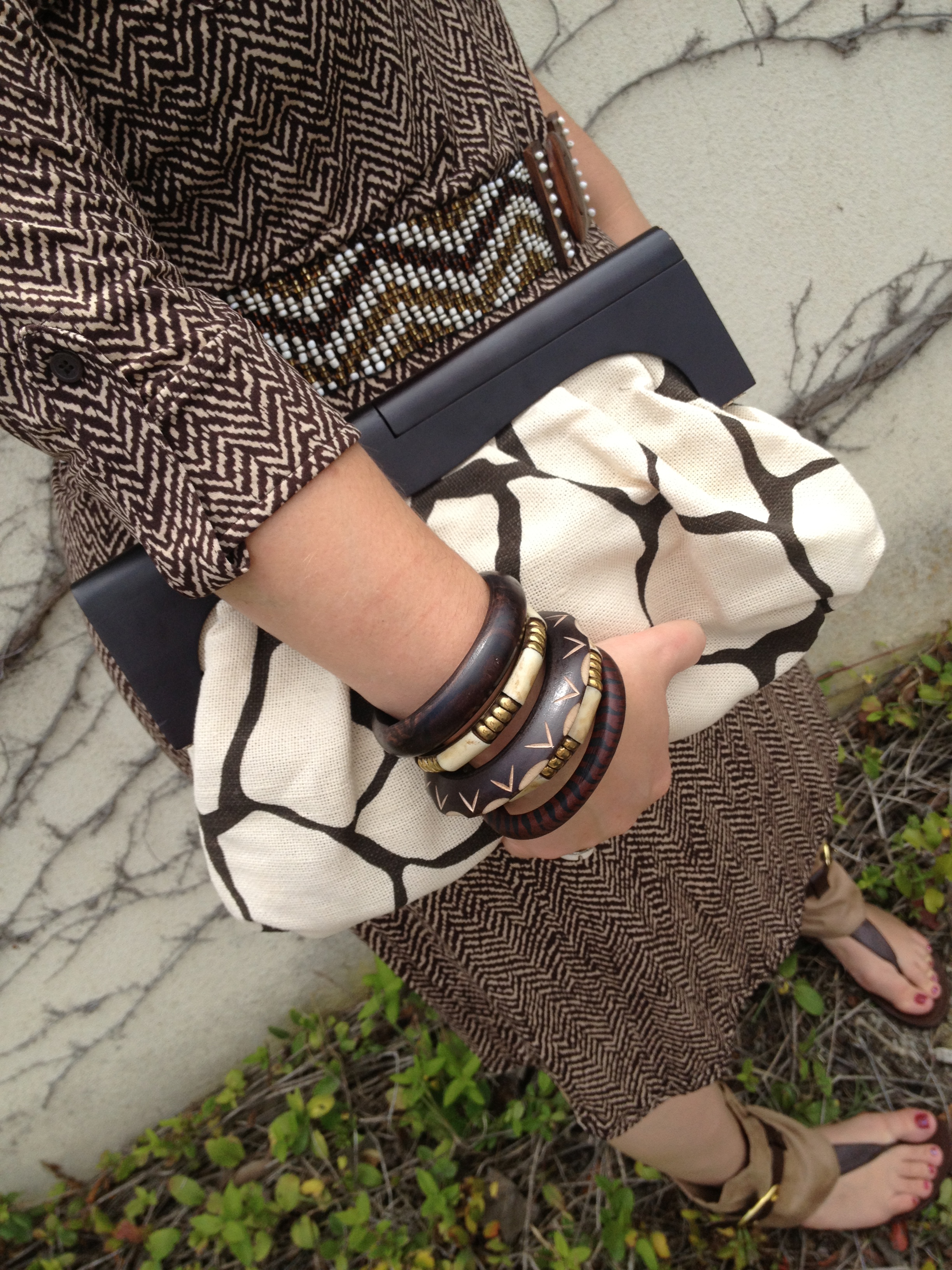 I try to wear as many bold colors and prints as possible but I also love warm, inviting tones that let patterns and textures stand out. This outfit layers different textures and shapes but keeps them from being overwhelming by using a neutral palette of browns and creams. Rich wood accents in the jewelry, belt and on the clutch keep this look earthy and grounded. How do you layer your look?