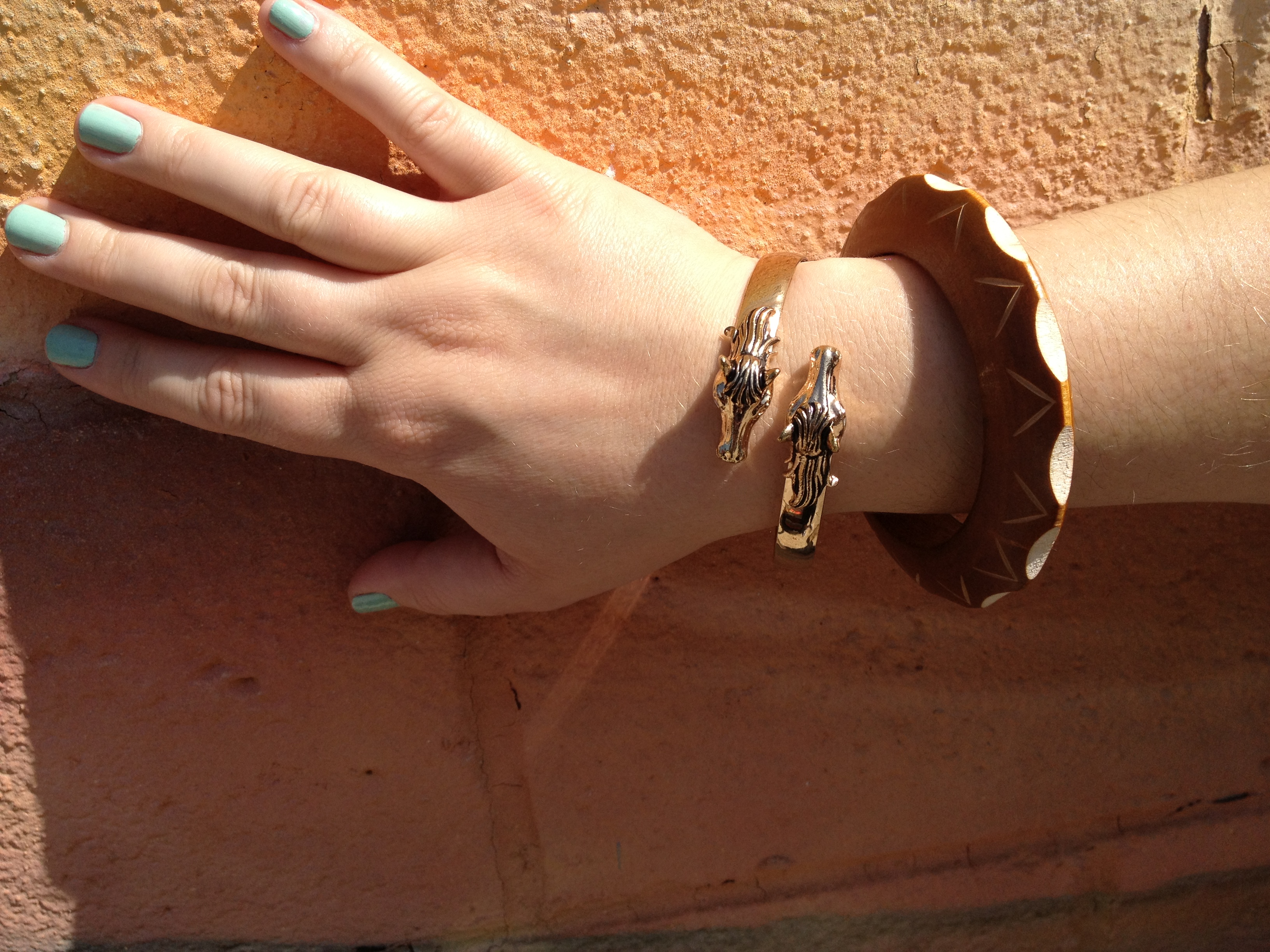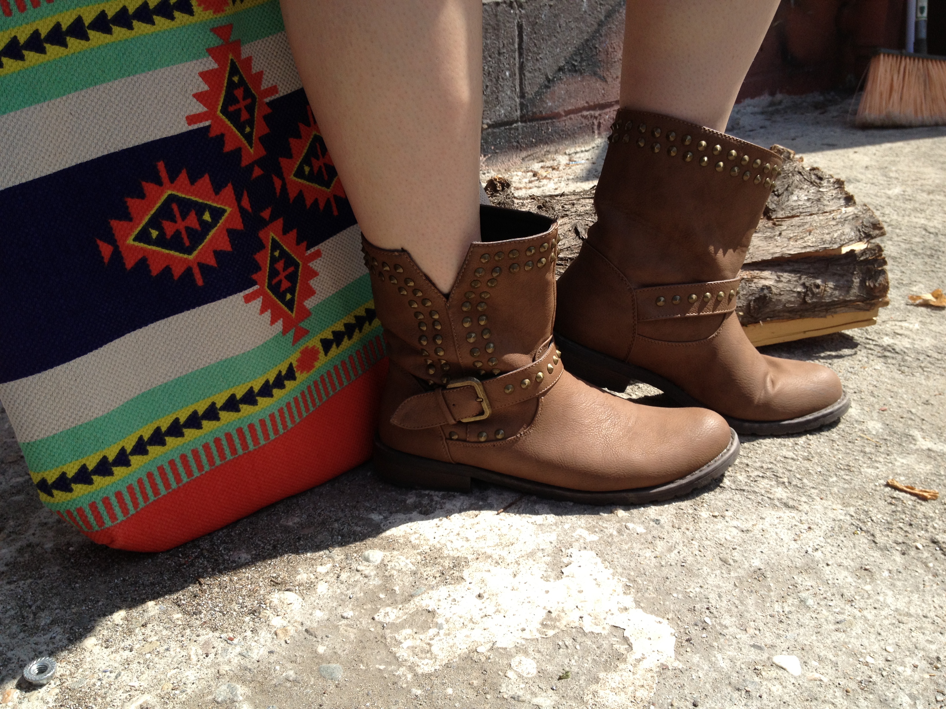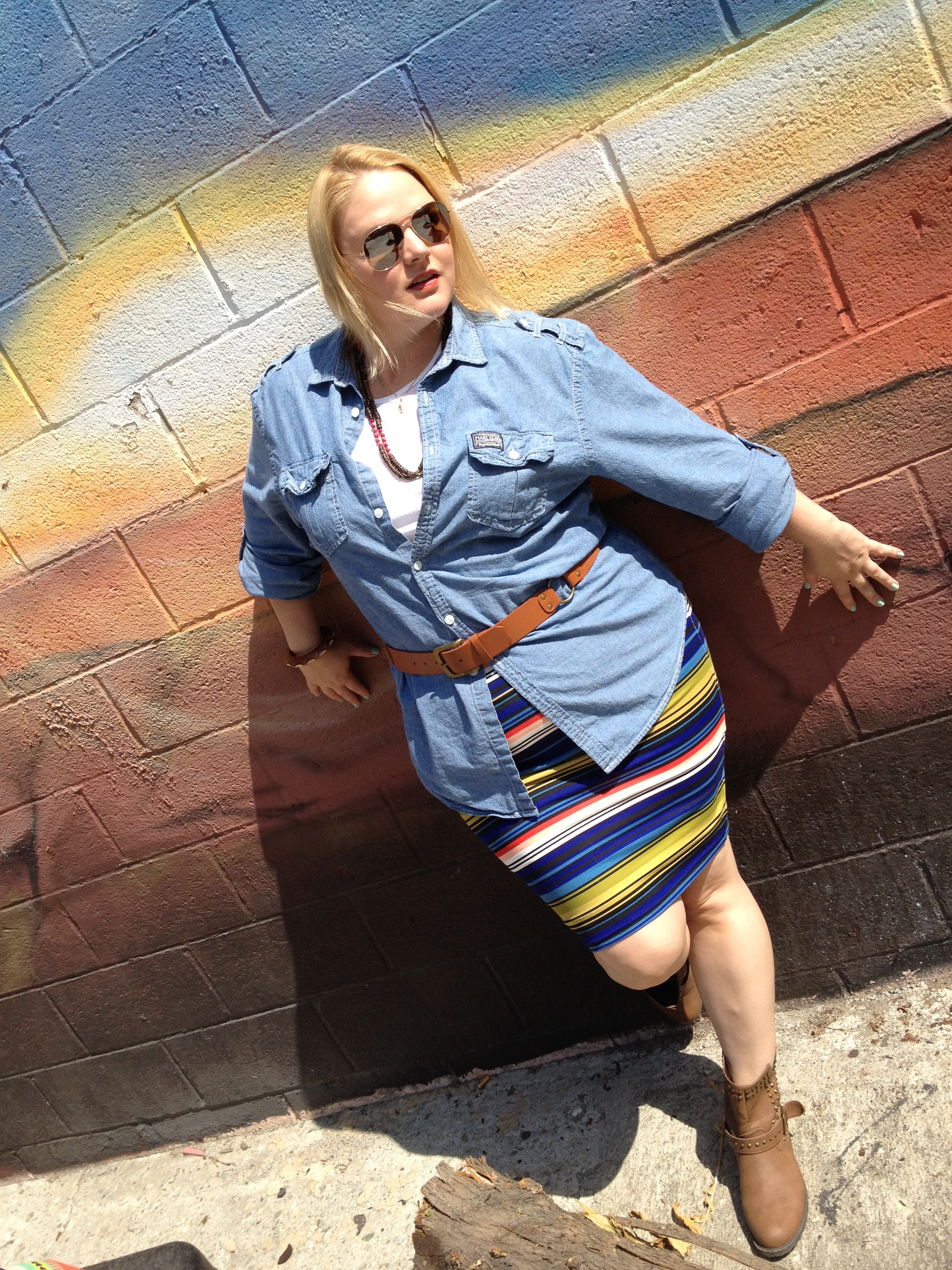 I am born and raised in Los Angeles and spent every Summer and Christmas at my Grandma’s house in Arizona.  The West is earthy, warm hued and holds my heart.  This outfit is nod to the West, old and new.  This skirt reminded me of a Mexican or Native American textile and I used it as the jumping off point when picking my accessories.  I layered a classic denim shirt and paired it with studded boots.  My favorites are the horse bracelet and mini Indian chief necklace – they embody the West.  Pardon me while I ride off into the sunset!