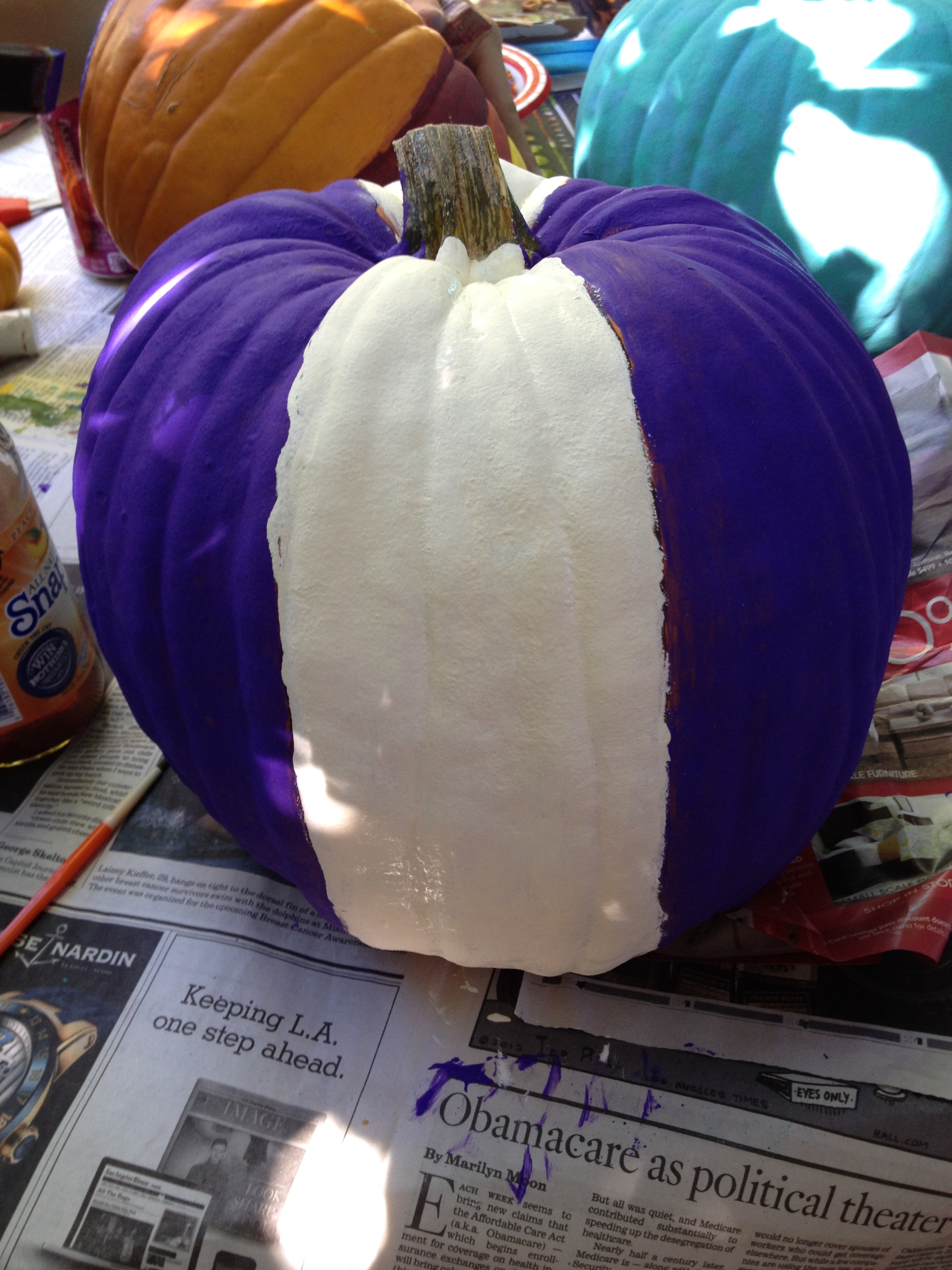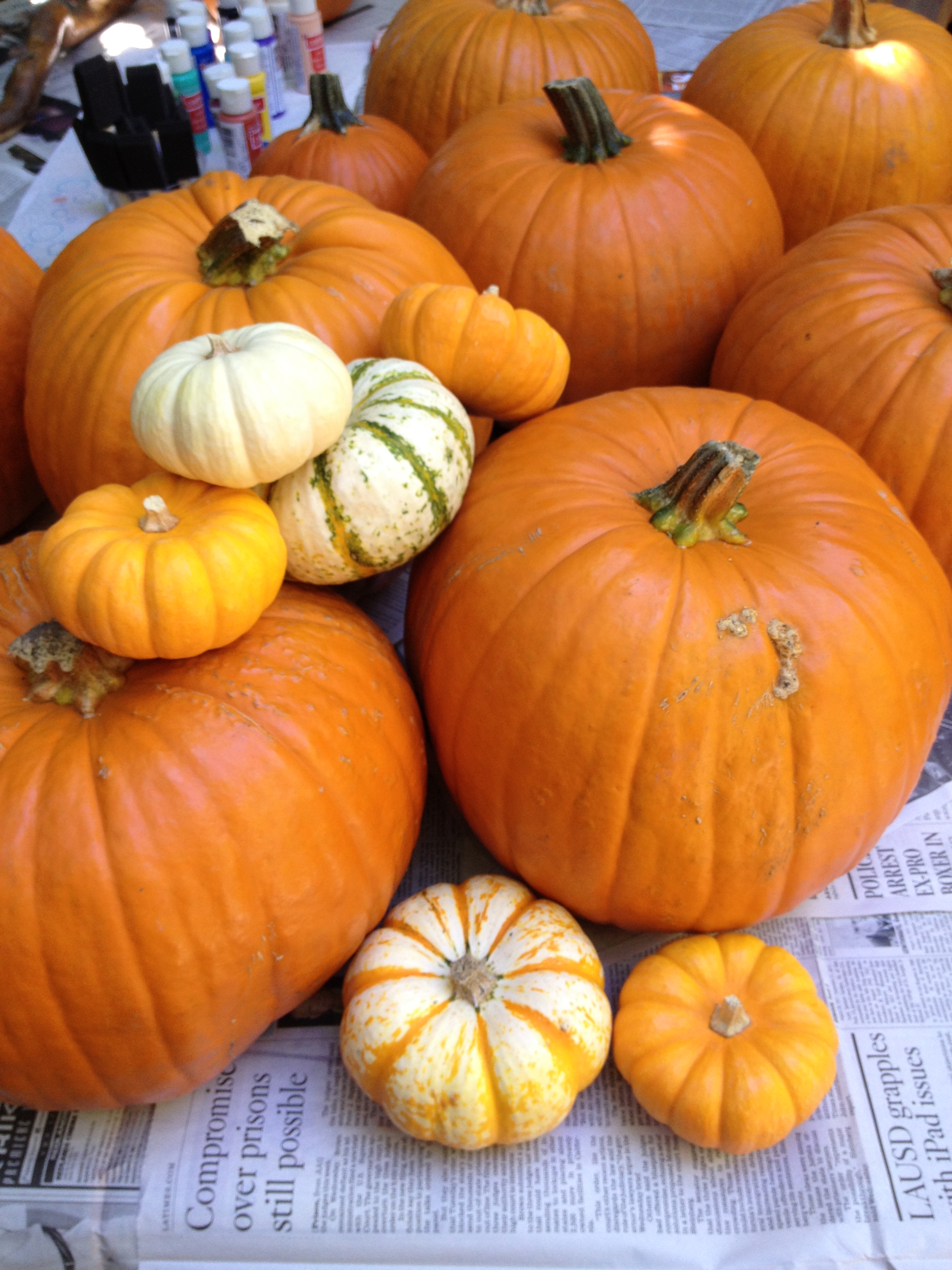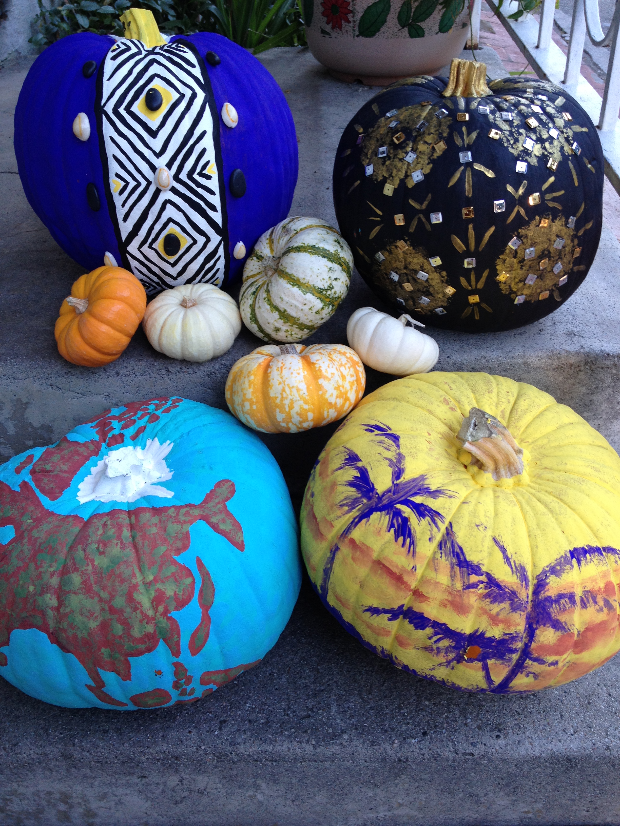 To kick off the month of the October and in the spirit of Halloween, I wanted to share my take on decorating pumpkins. I am not a big pumpkin carver and this year we will actually be on vacation during Halloween, so I thought I could paint and decorate pumpkins instead of making Jack-o-lanterns. This is a great way to get in the holiday spirit early, as painted pumpkins last a lot longer than carved ones. With my travel spirit in mind, I decided to create global inspired pumpkins from different locales and cultures. On Sunday, we had a great family pumpkin painting day and bbq with my siblings, nieces and nephew and my Pop. Here are a few of my creations with tips on how to create a few of them.