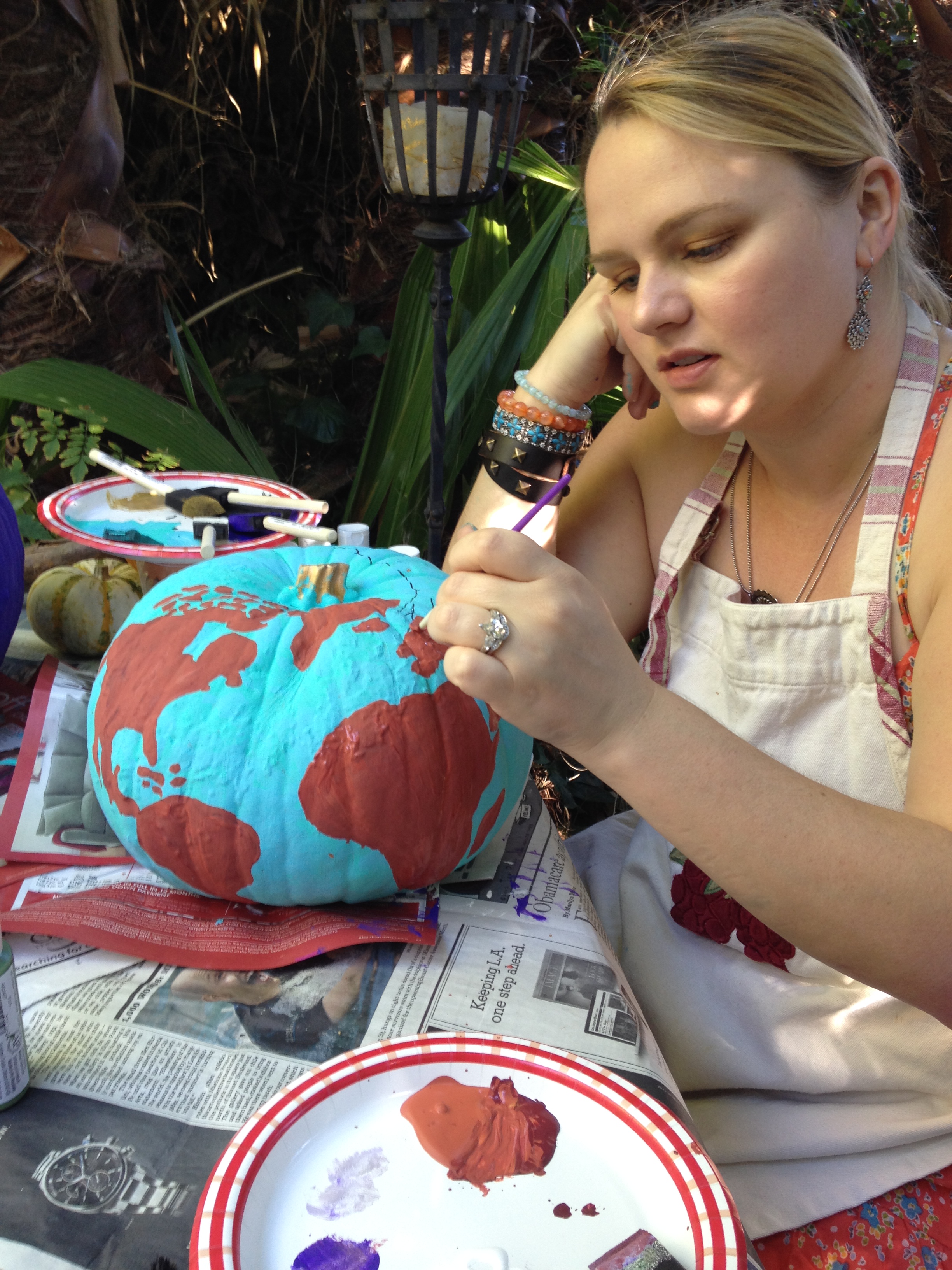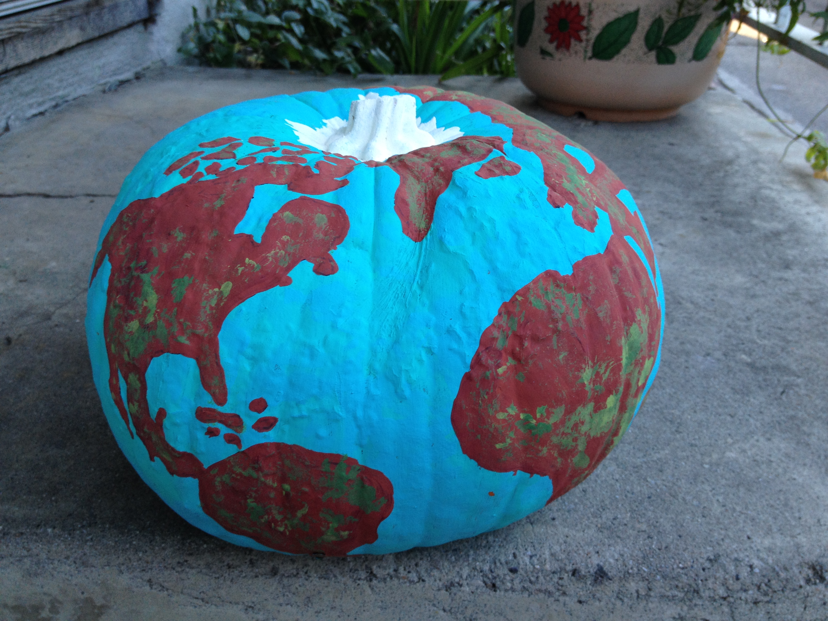 Travel is my passion so the last pumpkin I created was of course, the globe! I layered 2 different blue colors on the pumpkin with a sponge brush, as the base, and then free-handed the outline of the continents with a marker, using a map as reference. I painted in the continents with a small brush and sponged green paint over the russet color to create depth. Lastly, I added white for Antarctica. I dig how it turned out.