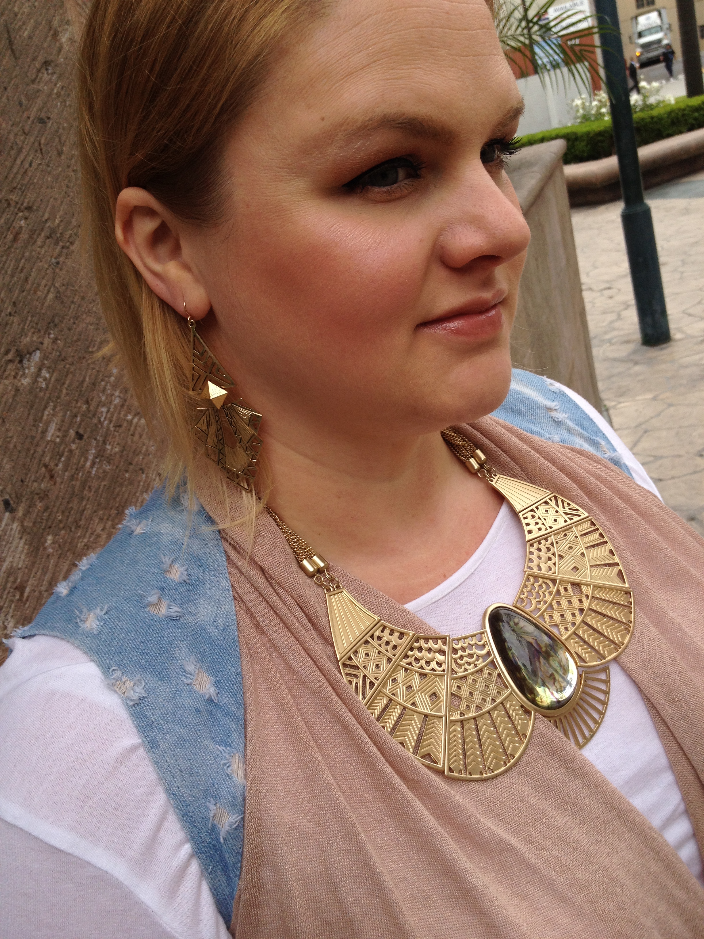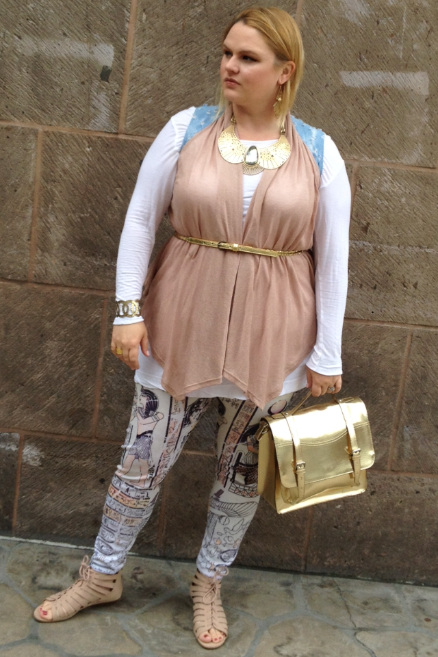 {Leggings/Forever 21 Plus, Top/Newport News, Vest/2b bebe, Sandals/Lola Shoetique, Bag/Belt/Target, Earrings/Cuff/Macy’s, Necklace/IAMSHEGLOBAL, Ring/Purchased in Egypt}