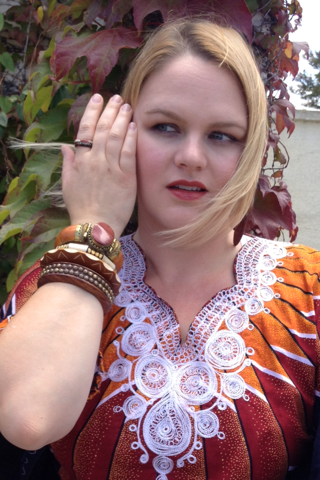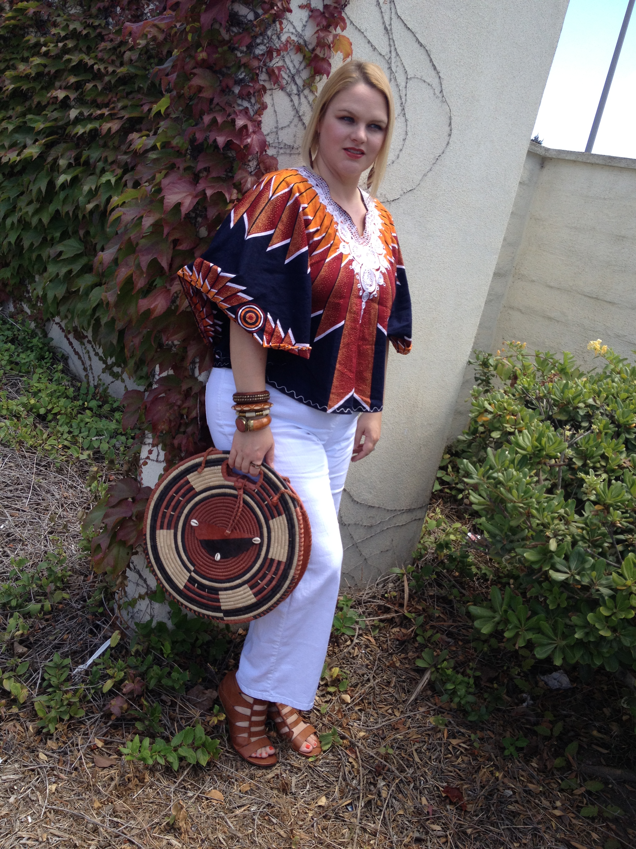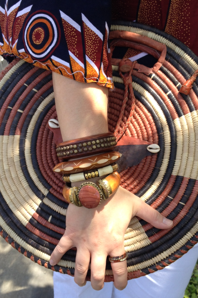 {Pants/Ross, African Top/Vintage, Sandals/Lola Shoetique, Mixed Bangles/Bought in Kenya & India, Hand painted Horn Ring/Bought in Kenya, Earrings/Claire’s, Bag/ Handmade in The Gambia}