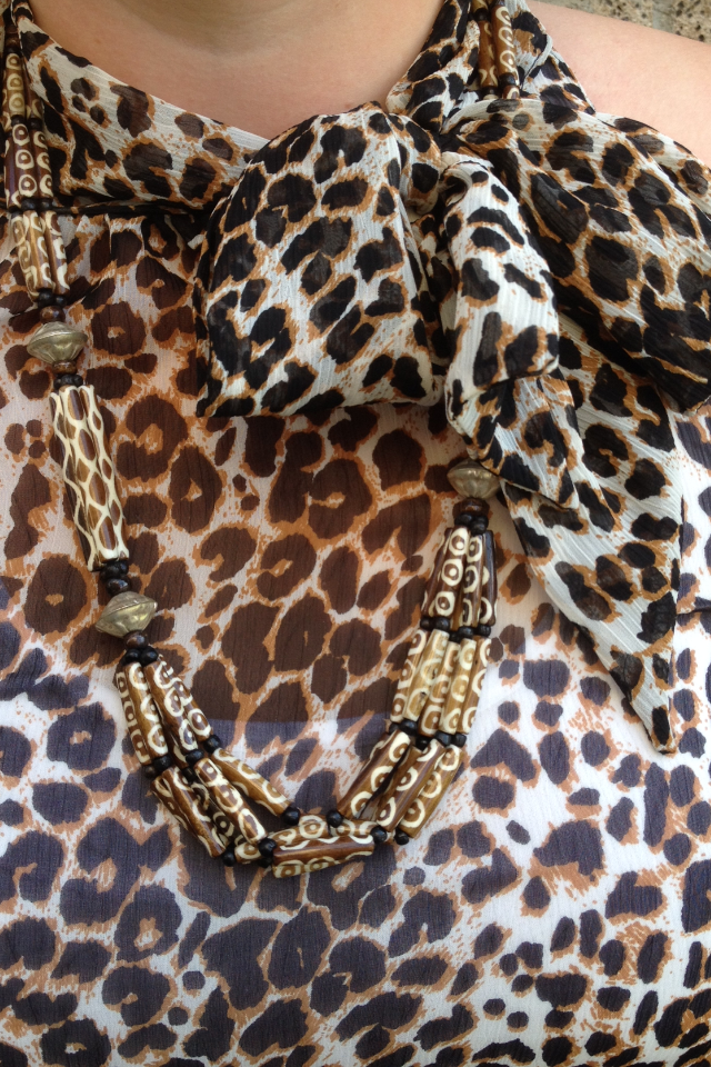 This Leopard print blouse with a feminine bow detail was the inspiration for this safari inspired look. Using a similar color palette throughout, I combined, leopard, giraffe and Ikat print set against crisp white pants for this Summer safari look. A batik bone necklace and carved bangles I bought in Kenya are the perfect African accessories to complete this look.