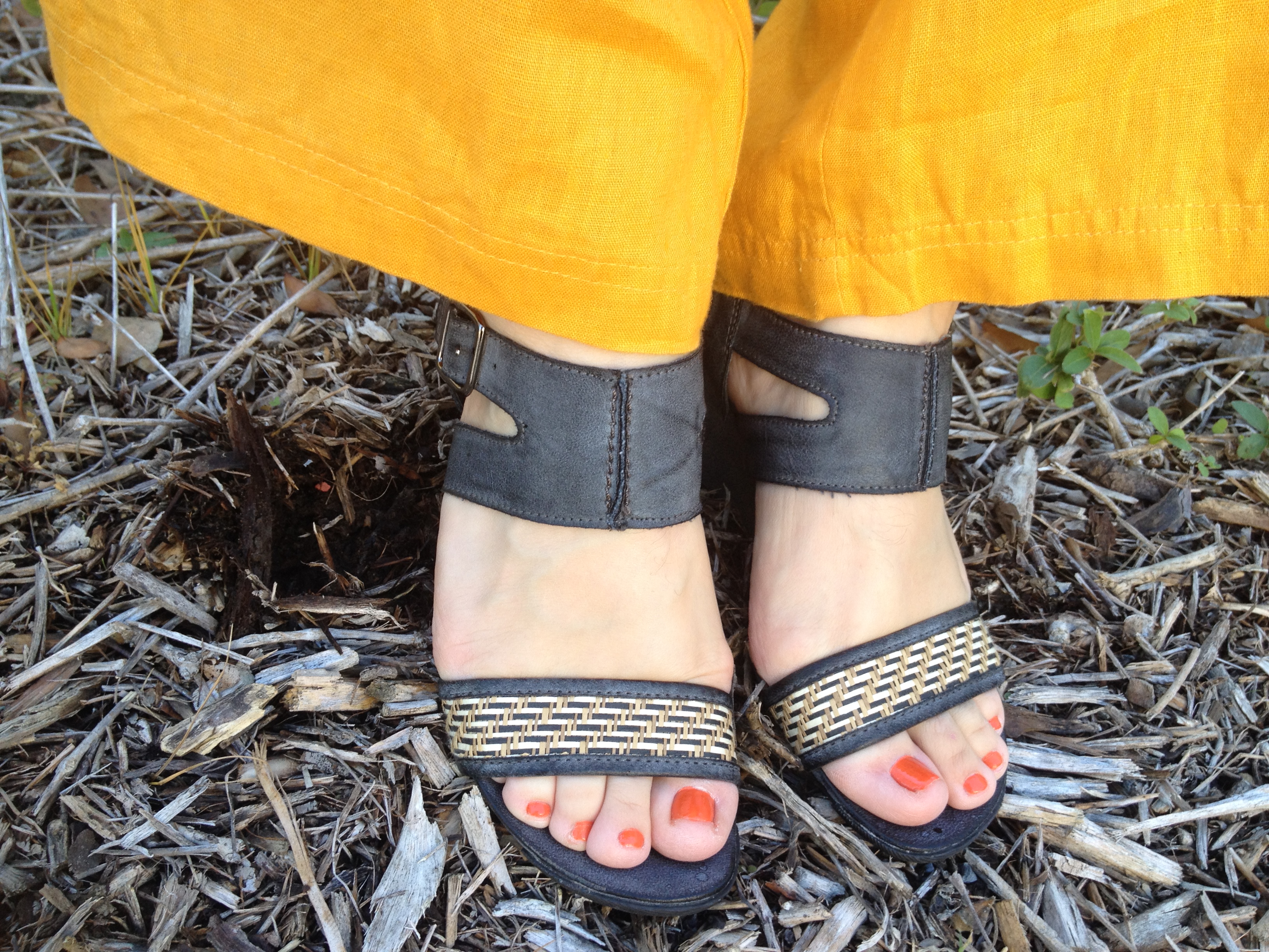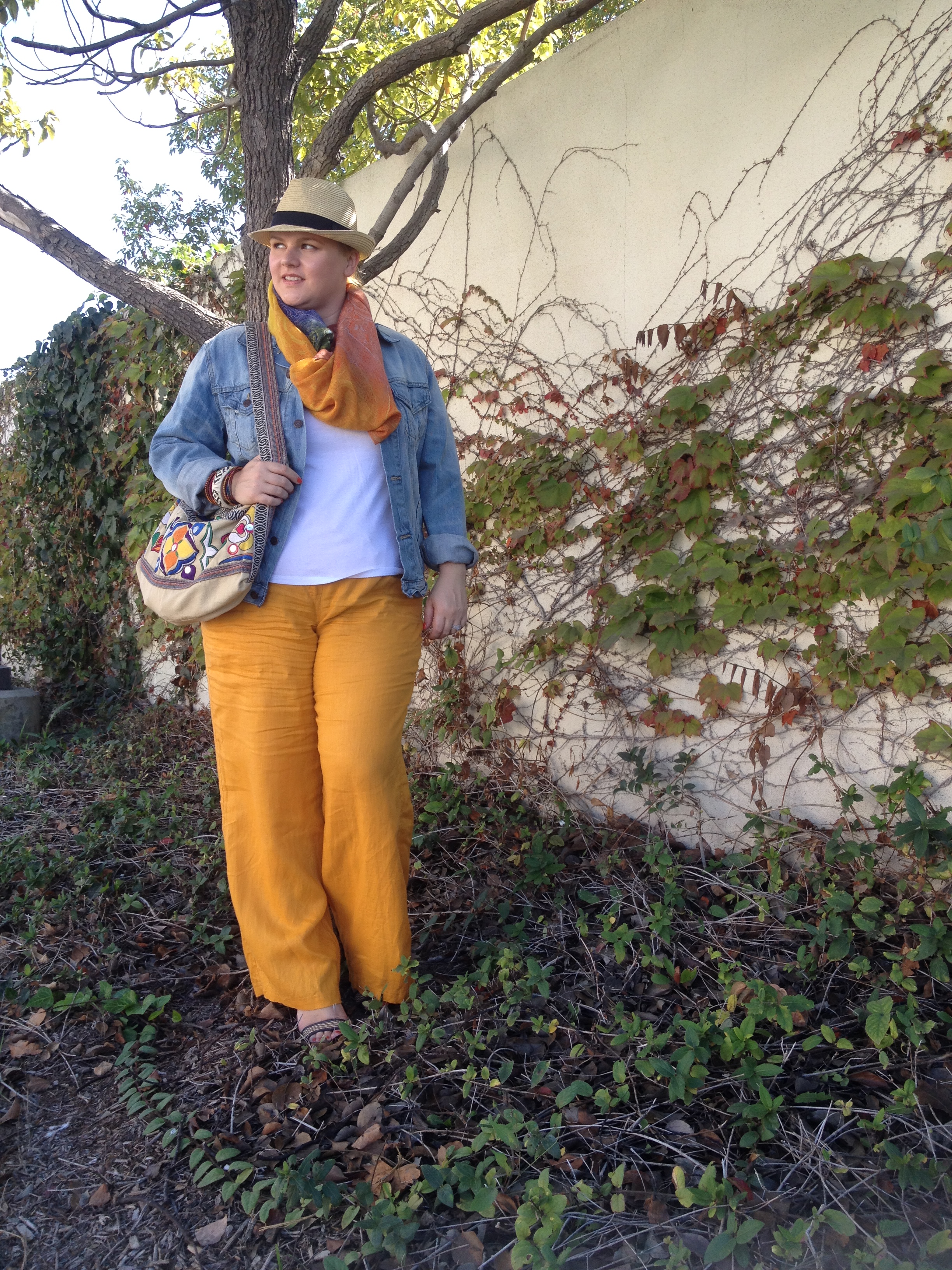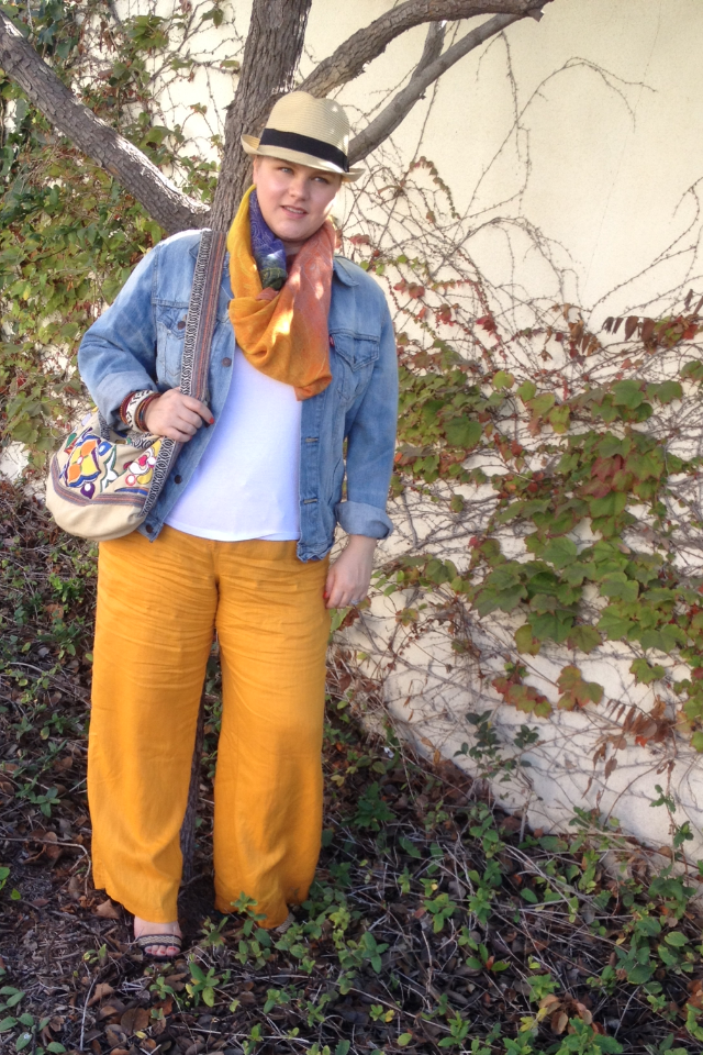 You’ll usually find me draped in accessories that I’ve picked up along my travels abroad, but yesterday, a beautiful Fall day full of errands called for a layered, comfortable ensemble. This is what I am more likely to wear, while I’m traveling the world. A flowy pant, layered with a light jacket, a versatile lightweight scarf (my favorite go to travel accessory by the way), sandals, a medium-sized bag, a few bangles and a hat (preferably a fedora). The colors of this look and the pieces made me feel like I should be strolling the cobblestone streets of a tiny village in a far off land, on market day. I love when fashion transports me to another place.