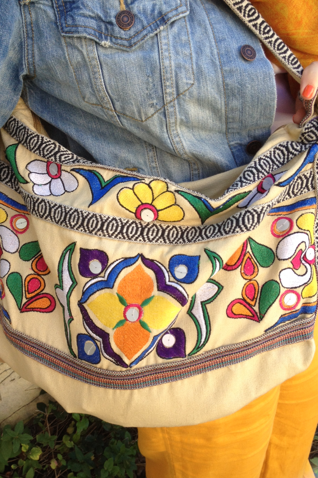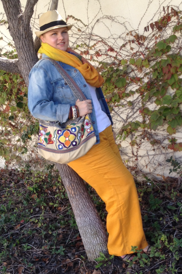 {Pant/Shirt/Macy’s, Sandals/Kenneth Cole, Jacket/Marshall’s, Scarf/Fedora/Necklace/Santee Alley, Bag/Alloy, Bangles/Bought in India}