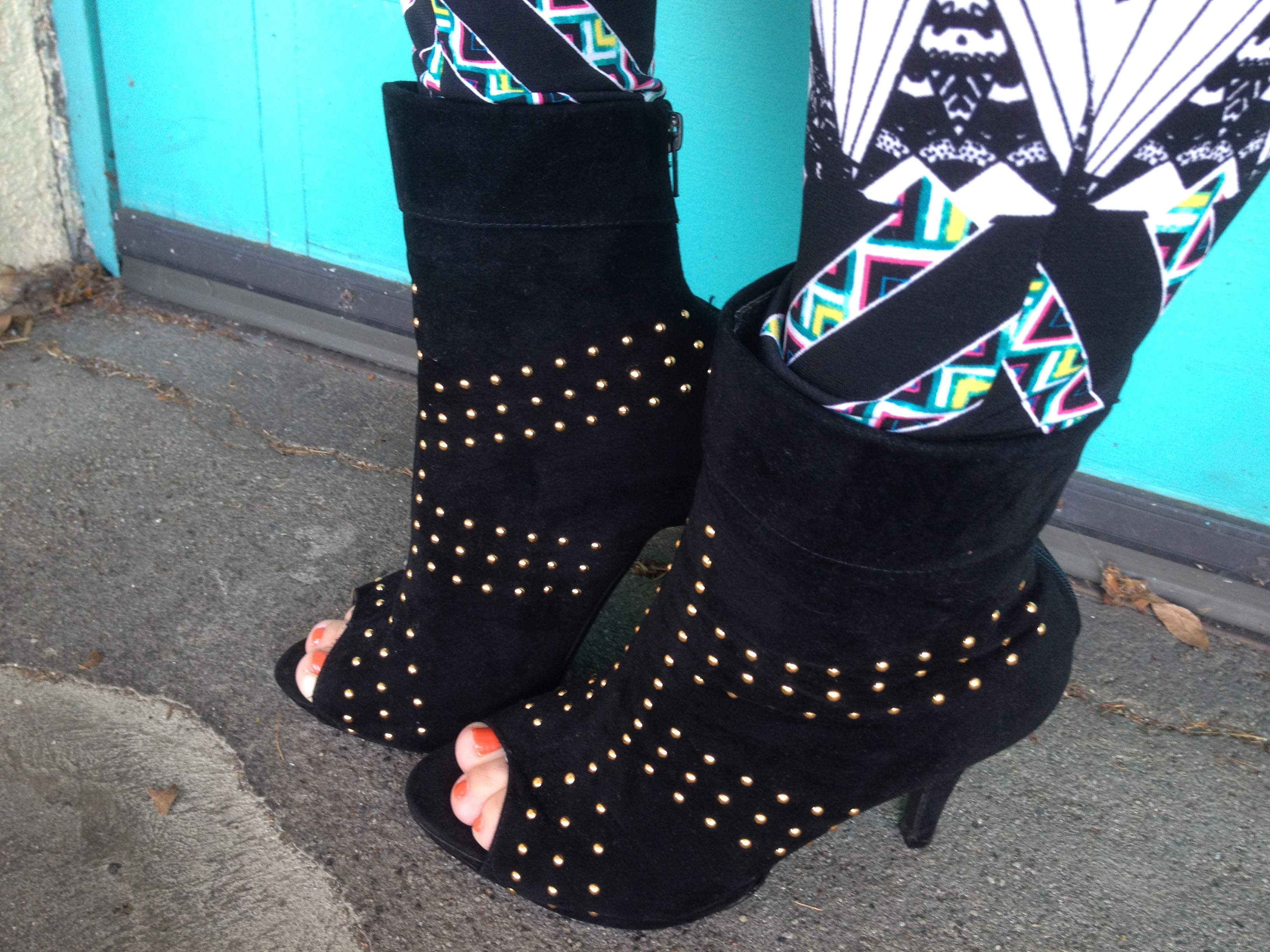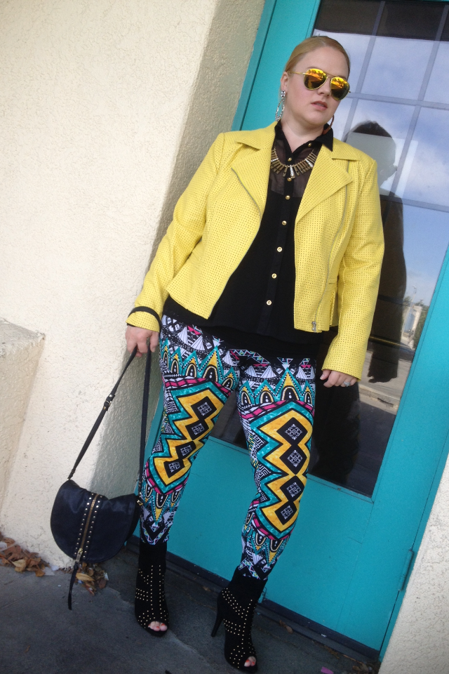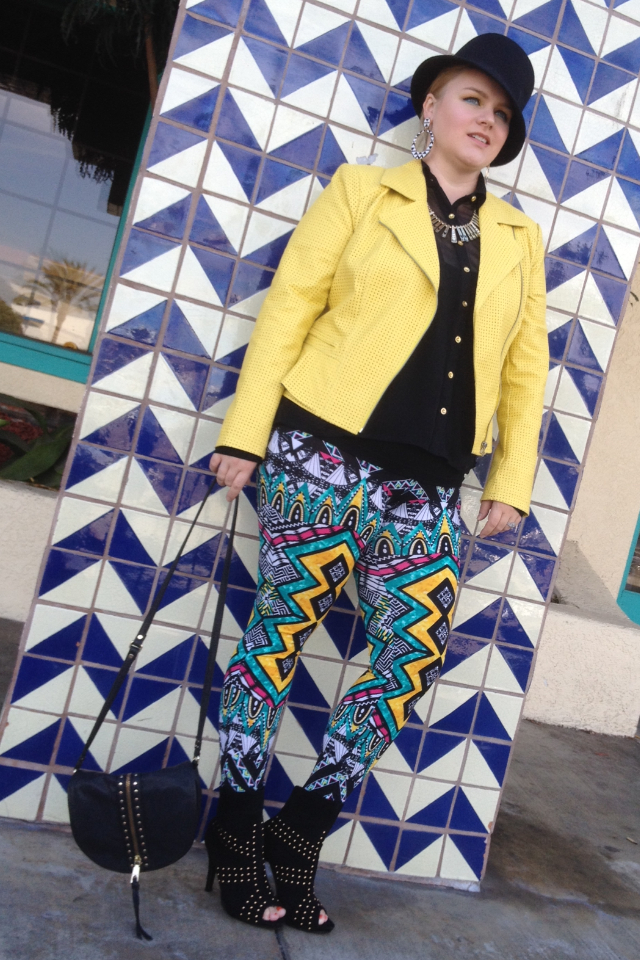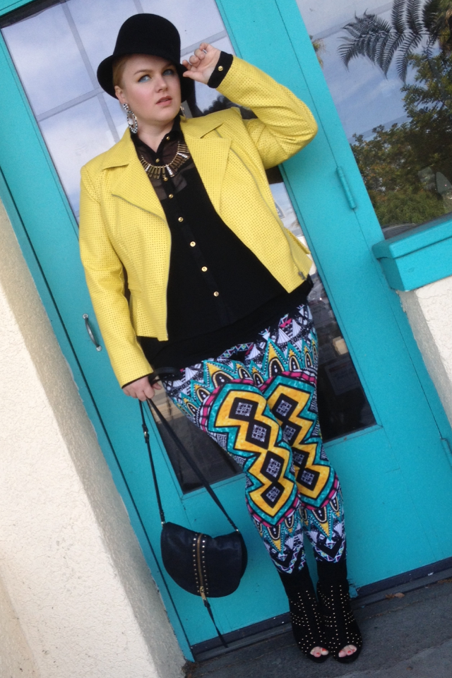 {Leggings/Blouse/2B bebe, Jacket/Necklace/Macy’s, Booties/AMI Club Wear, Handbag/Hat/Thrifted, Earrings/Forever 21, Glasses/Claire’s}