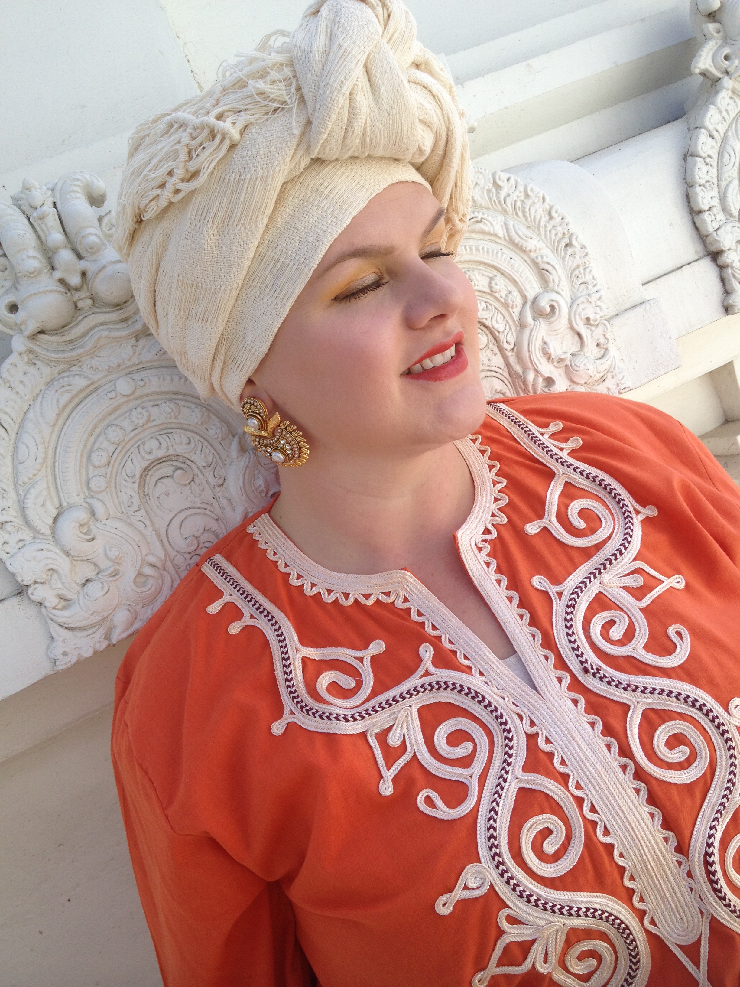 {Pants/Macy’s, Tunic/Isis Ring/Bought in Egypt, Earrings/Bangles/Bought in India, Shawl worn as a headwrap/Bought in Mexico, Shoes/Forever 21}