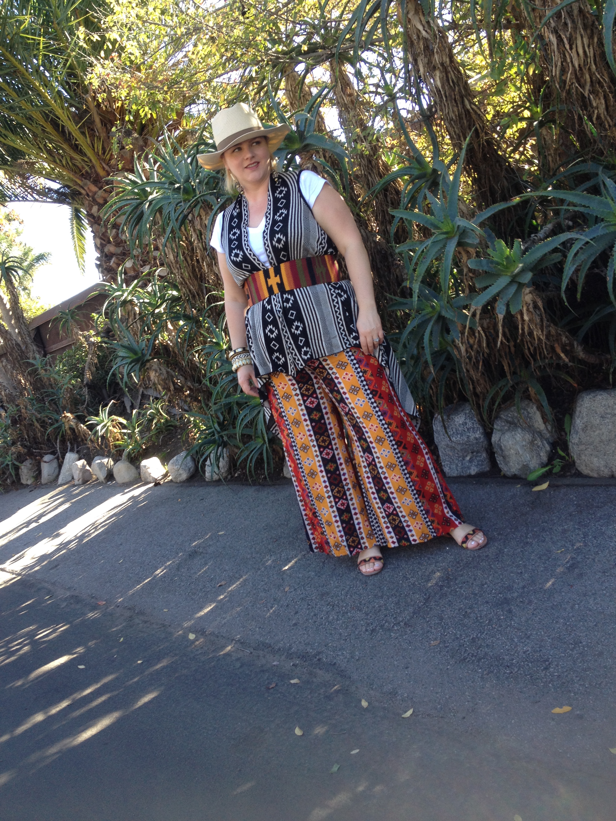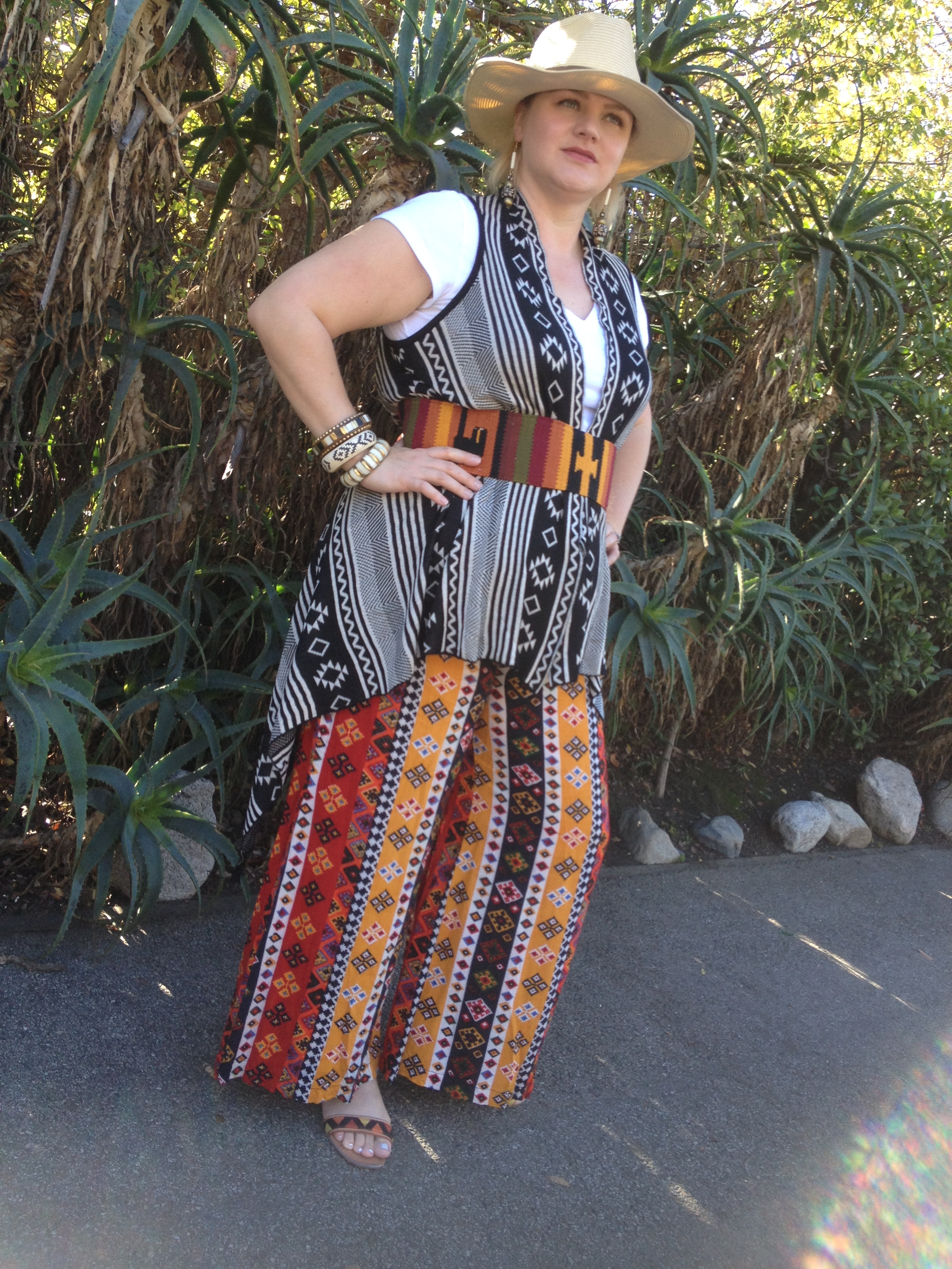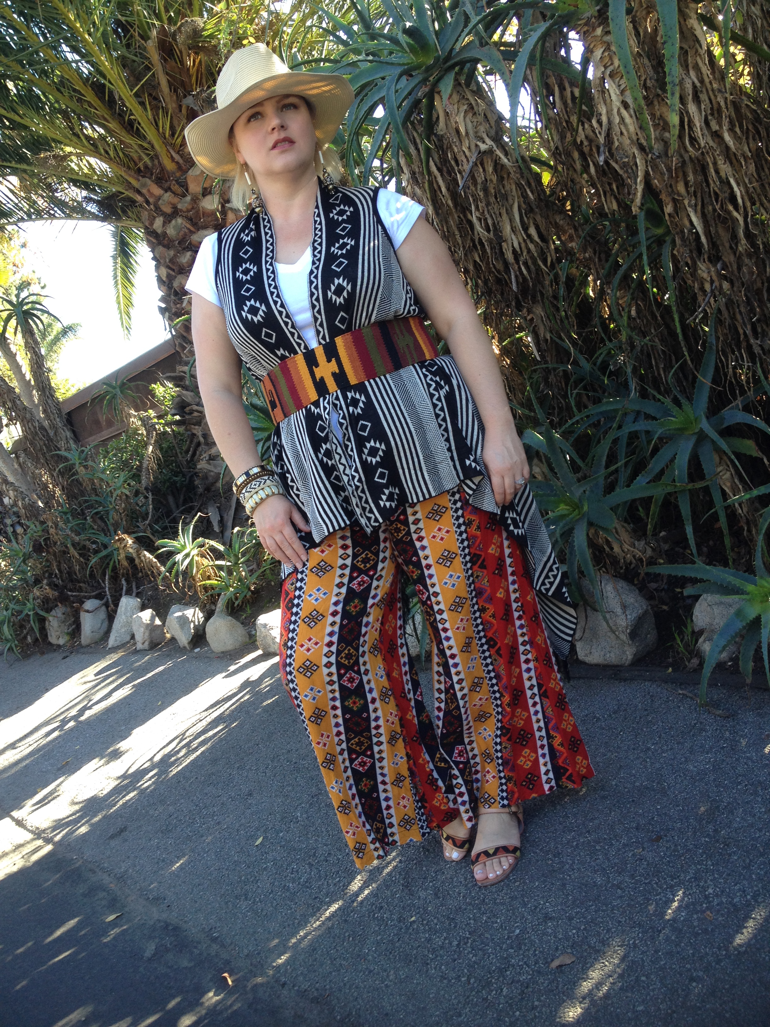 {Pants/Marshall’s, Vest/Downtown L.A., Sandals/Target, Belt/Bought in Isla Roaton, Bangles/From India, Earrings/Ventura Flea Market, Hat/Bought on cruise ship}