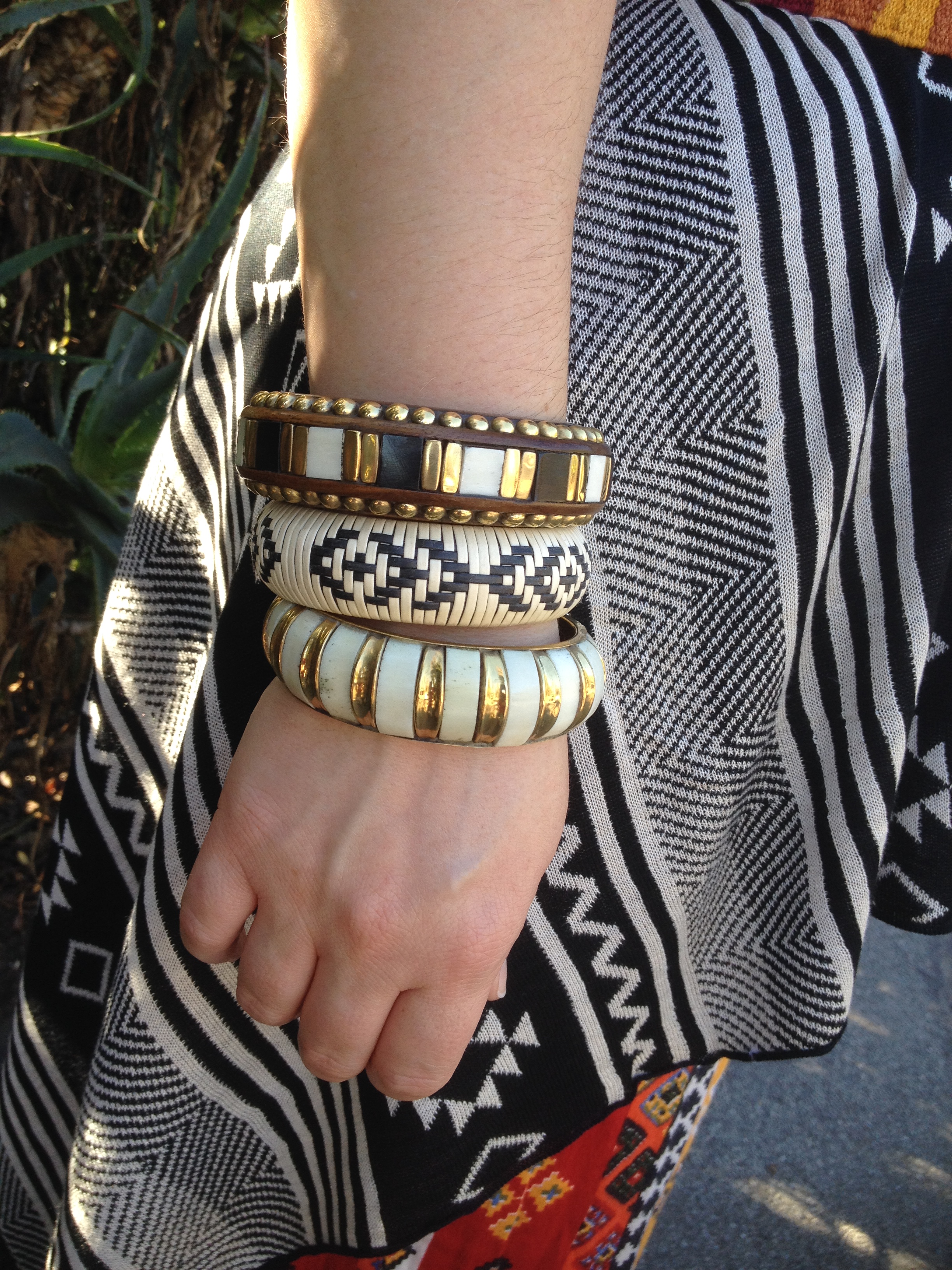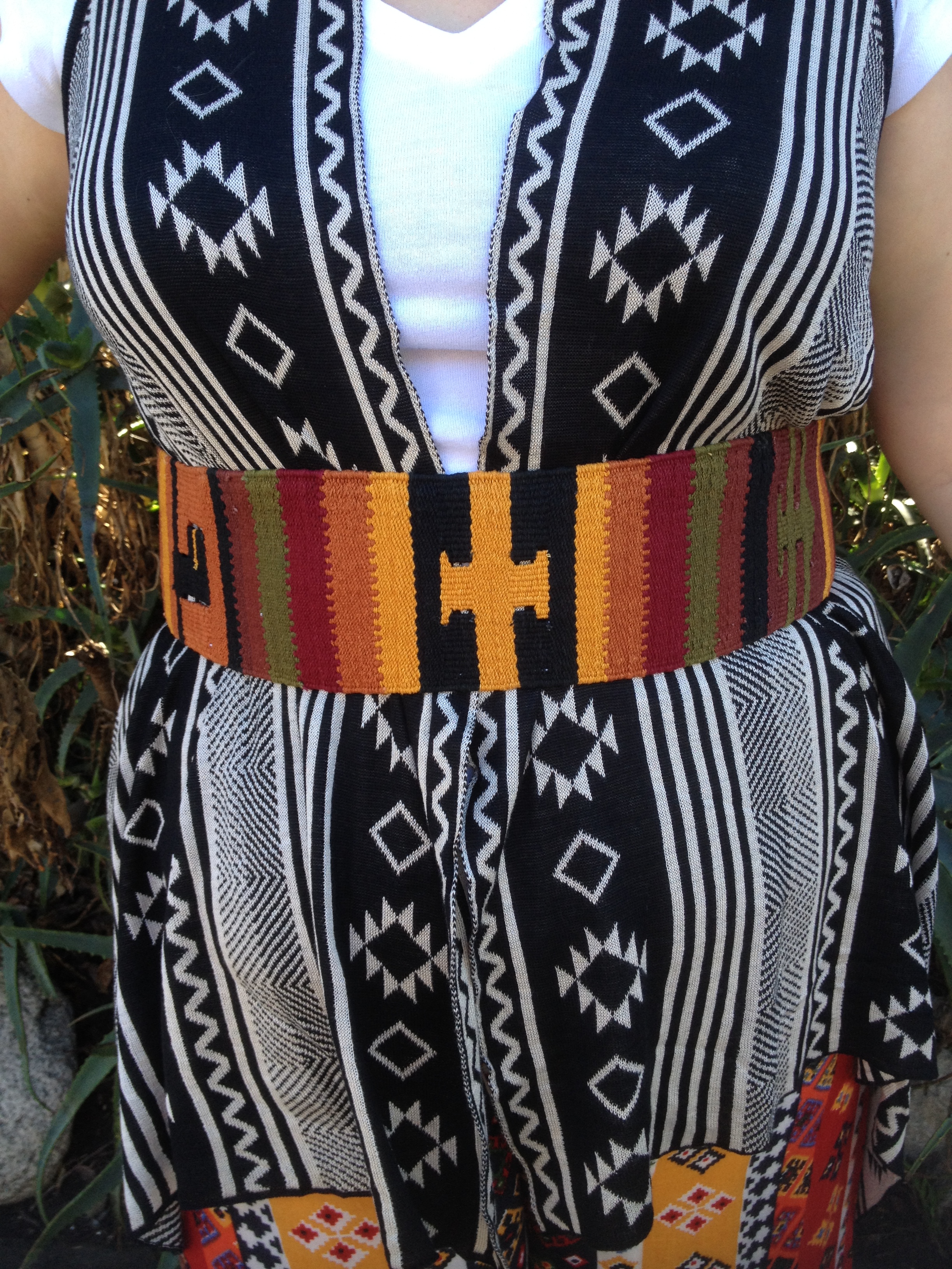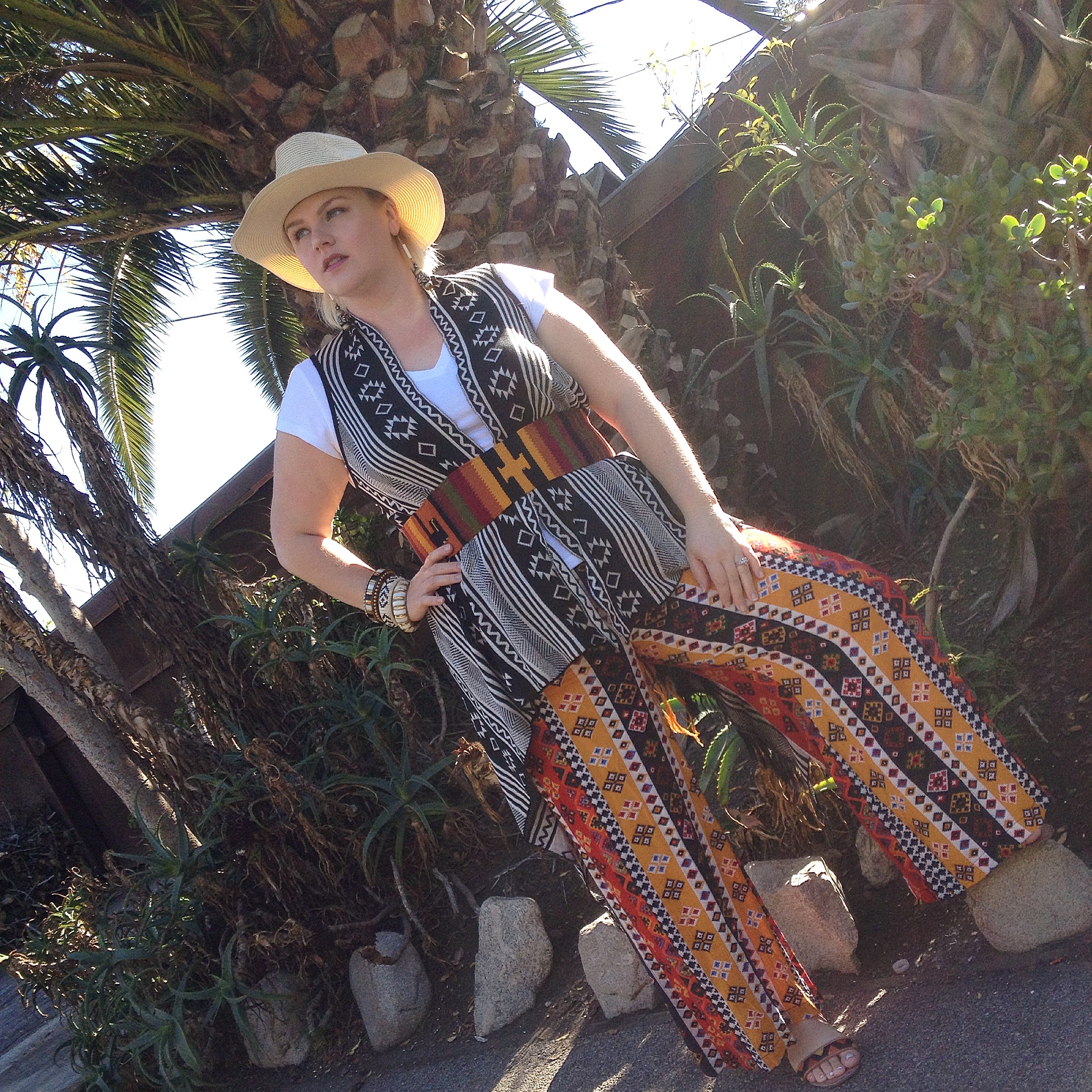 {Pants/Marshall’s, Vest/Downtown L.A., Sandals/Target, Belt/Bought in Isla Roaton, Bangles/From India, Earrings/Ventura Flea Market, Hat/Bought on cruise ship}