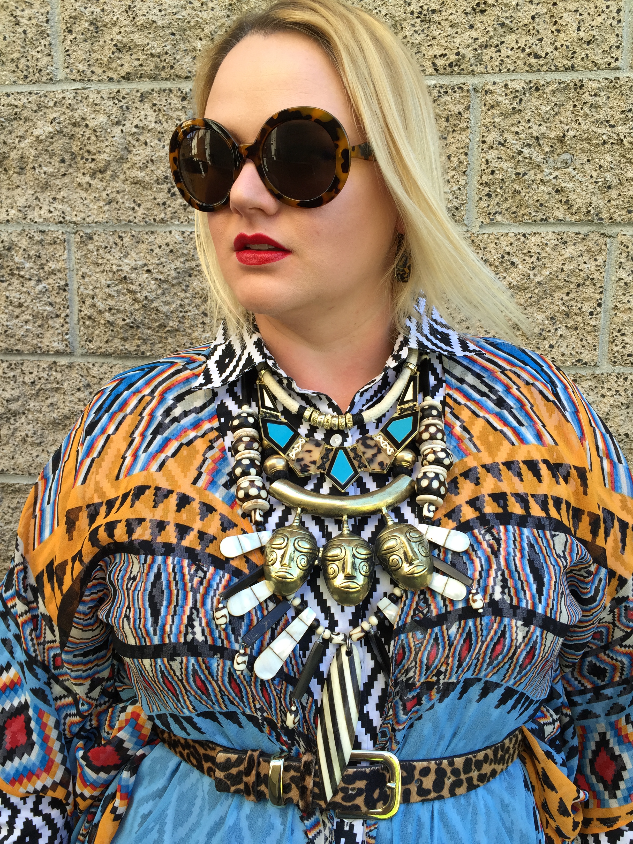 {Pants/Love Culture, Shirt/Jones New York, Cover Up/Marshall’s, Shoes/INC International Concepts, Belt/Target, Bracelets/From Mali, Top Necklace/Glasses/Claire’s, Middle Necklace/From Nepal, Black and White Necklace/Handmade by me, Earrings/Macy’s}